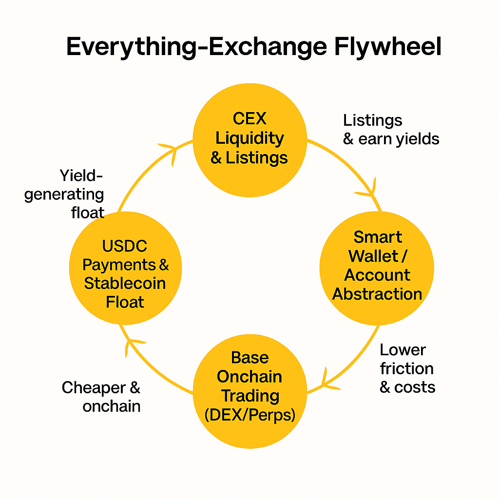 Each node is both a product and a distribution surface. USDC lowers payment friction, Base lowers transaction costs and time-to-ship, while derivatives/custody monetize depth. The flywheel keeps users inside Coinbase’s rails—on and off chain. The Q3 letter explicitly ties these pillars together under the “Everything Exchange” vision.