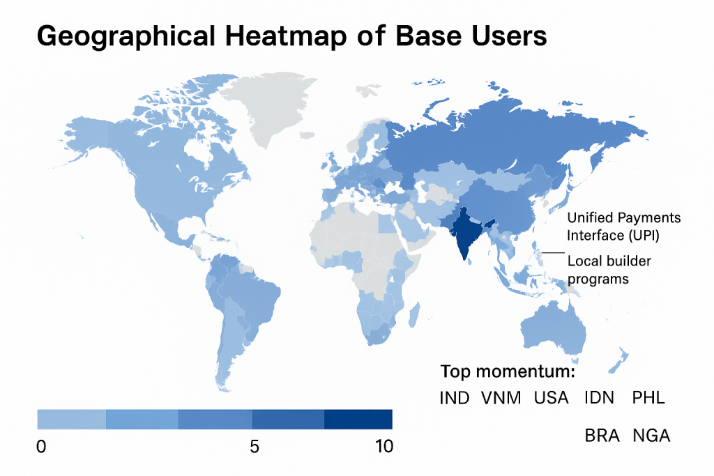 Hard wallet-level geodata is scarce, but programs, events, and third-party indices point to India as Base’s highest-leverage growth surface: most builders per dollar of incentives and the fastest conversion from hackathon → live app. Chainalysis rankings and UPI scale reinforce the macro.