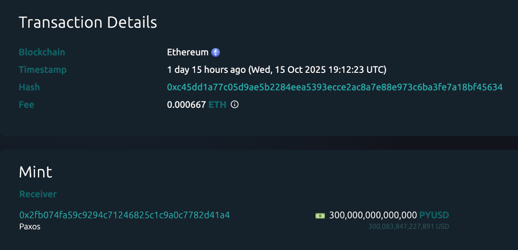 On Oct 15, 2025 at 19:12 UTC, a Paxos-controlled address (“Paxos 7”) called increaseSupply on the PYUSD contract and minted 300,000.00 B PYUSD—that’s 300 trillion tokens. At 19:34 UTC, the same address called decreaseSupply and burned the entire amount. Gas to mint: about $2.47. Gas to burn: about $2.23. No funds moved to exchanges or lending markets in between. That’s why nothing blew up.