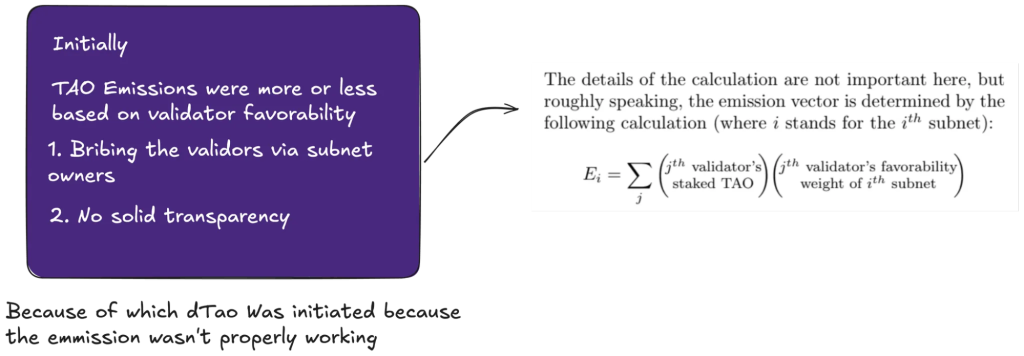 Before dTAO, emissions were set by validator weightings—hard to scale, easy to game (vote your own subnets, side deals), and often apathetic.