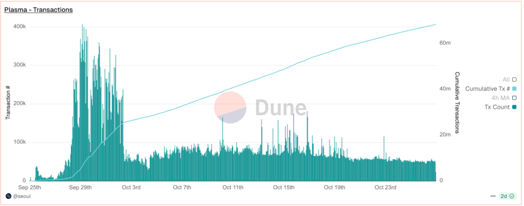 The major spikes visible is the time period when Plasma’s mainnet beta + $XPL token went live, with press and dashboards hitting the same day. So the spikes is mostly genesis effects (token + airdrops + listings + liquidity bootstrapping), which gets normalised afterwards.