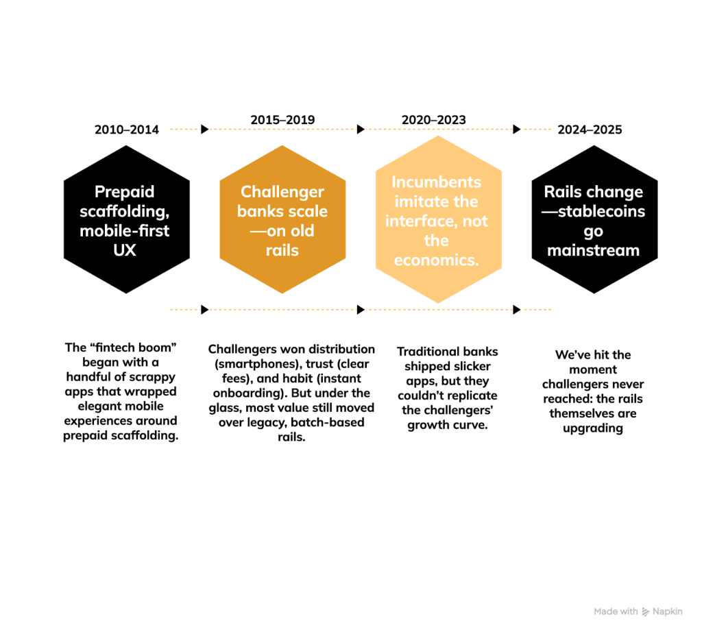 Stablecoins are mature—with a $200B+ market cap, proven stability, and regulatory frameworks in place. Networks are fast and cheap: Solana, Base, Plasma, and Mantle handle thousands of TPS at sub-cent fees. UX is dramatically better thanks to account abstraction, social recovery, and embedded wallets—crypto feels like Venmo now. Regulations are clarified, with hurdles removed by the GENIUS Act (US) and MiCA (EU). And the infrastructure is plug-and-play: Circle/Tether APIs, Fireblocks custody, and Plaid-style onboarding mean we don’t need to reinvent the wheel.